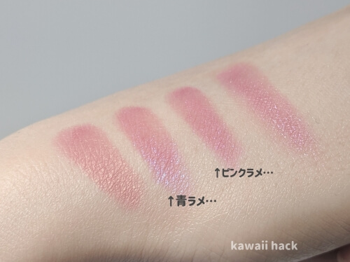 ベースは同じような色だけどそれぞれ違う色のラメが入ってるんだよ…このパレットを企画した人、おもしろいなあ。