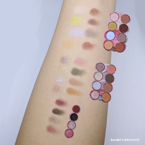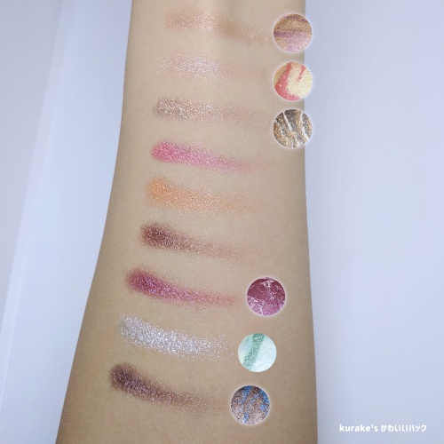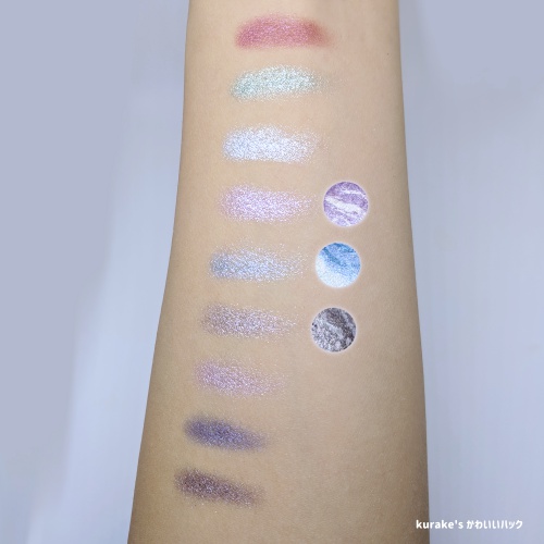 Solar Flareは名前の通り、黄味がかった色が集結しているパレットです。Aurora Lightsはメタリックで鮮やかな色、supernovaはメタリックでスモーキーというかダークな色がソロっていう印象。
