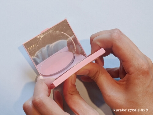 プレスドパウダーとピンクのチークは以前1つ売りで購入した時のケースに入ったままなので、まずそのケースからパンを外す必要があります。