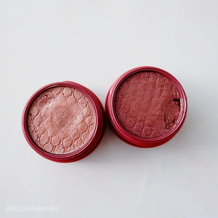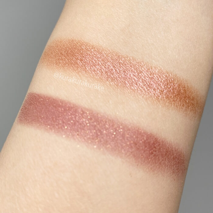 今回は珍しくSSSだけでなくパレットも購入したのですが、色に関しては2色ともパレットに似たような色があって、どちらも色が濃い目なのでパレットと併せて使うと相乗効果があるって感じではなかったです。