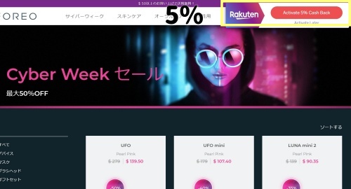 これはよく海外通販を利用する方には特におすすめなのですが、Rakuten/ebatesというアメリカで楽天が行っているサービスに登録するとFOREO公式ならさらに5%安くなるんです。