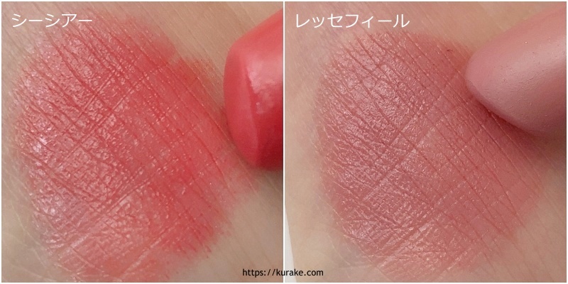 2つともライトなピンクだけど、レッセフェールのほうがくすみ感と青みが強いですね。