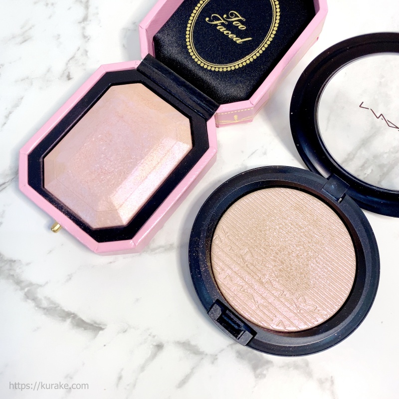 MACのショーゴールドはベースが透明で光が当たったところがピンク色に光るタイプなのですが、TooFaced にくらべるとかなり強めに光ります。テクスチャもMACのほうがしっとりで粉が分厚く乗るタイプ。