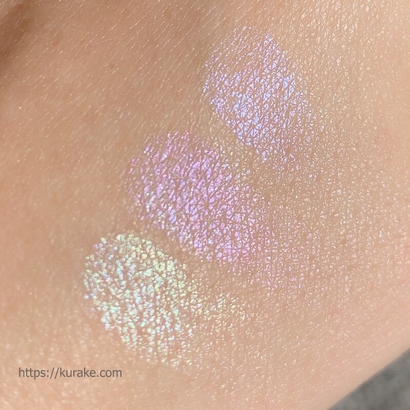 肌の上に塗ったところをよく見るとちゃんとオーロラカラーになっていて、光が当たるとそれぞれの色が分かります。すごい!こんなハイライター他にあるか???