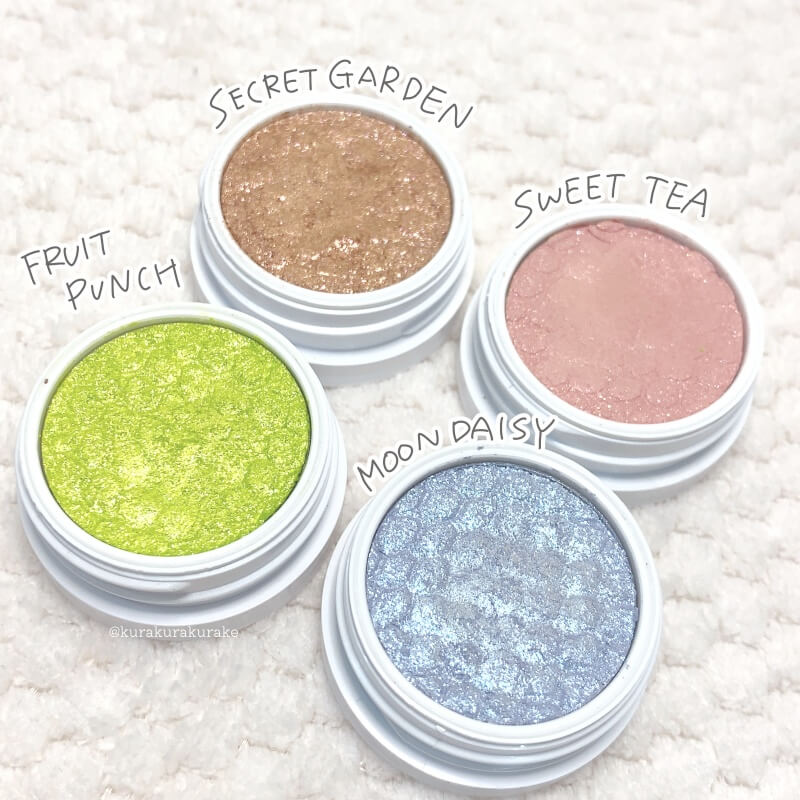 黄緑がFRUIT PUNCH、ピンクがSWEET TEA、ブラウンがSECRET GARDEN、ブルーがMOON DAISYという色名です。